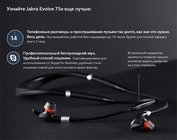 Гарнитура Evolve 75e отвечает самым взыскательным требованиям: решение имеет профессиональное качество звука, систему активного шумоподавления и сертификацию для использования с различными голосовыми приложениями, в том числе и со Skype for Business.