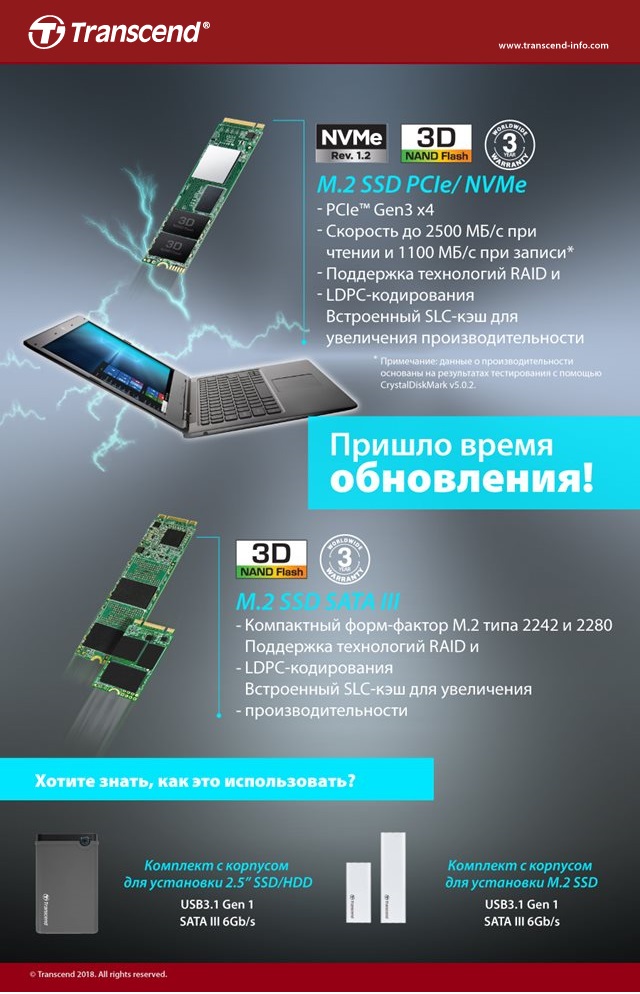 ИНФАТЕК-СЕРВИС представляет твердотельные накопители от компании Transcend: SSD со скоростным интерфейсом нового поколения SATA III 6 Гбит/с в компактном форм-факторе M.2 и новейшие высокопроизводительные SSD с интерфейсом PCI Express® Gen3 x4 с поддержкой стандарта NVMe™. А также удобные комплекты с корпусами для установки M.2 SSD и 2.5" SSD/HDD, позволяющие использовать твердотельный накопитель как внешнее портативное устройство.